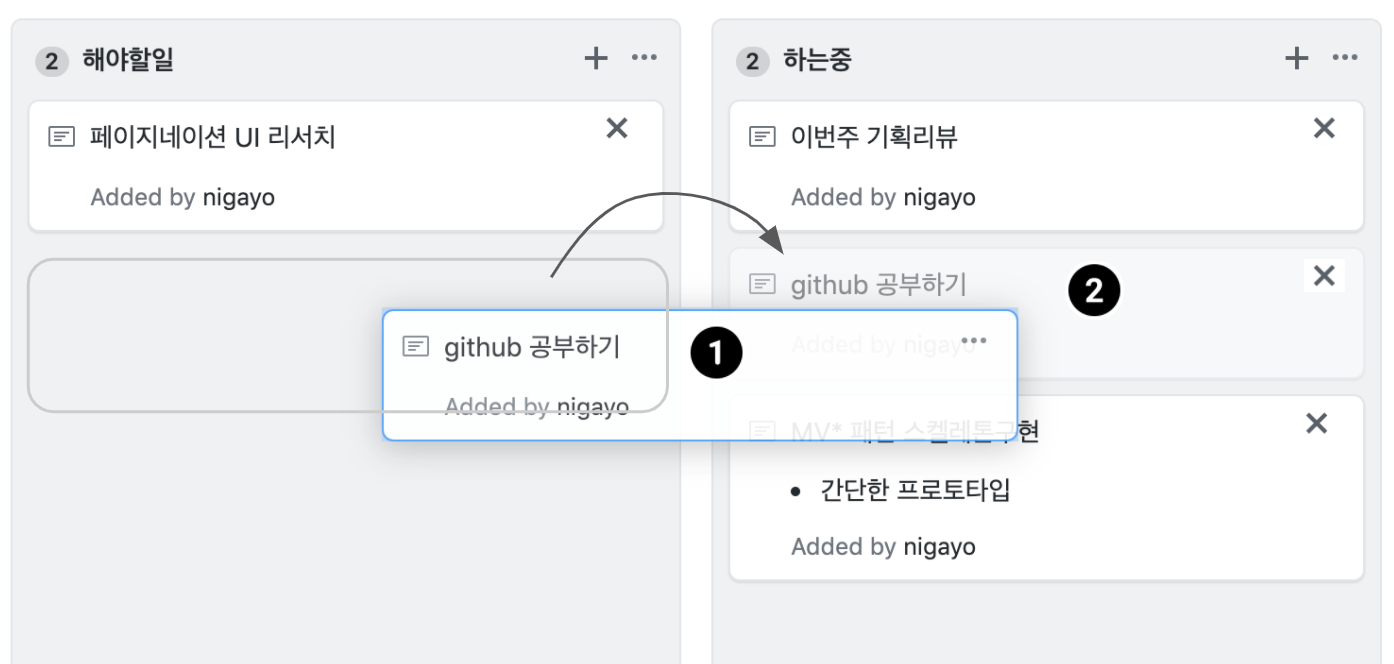 같은 컬럼 뿐 아니라, 다른 컬럼으로도 카드를 옮길 수 있습니다.